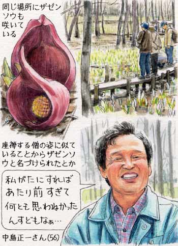 ![]() | ハンノキ林に広がる湿原の広さは約3ha。清らかな雪融け水が流れる一帯に約6万株ともいわれるミズバショウの花が咲き始めるのは4月上旬から。湿原に延びる木道を散策していると、花の甘い香りが漂ってくる。 今年で10回目を迎える田沢湖町刺巻(さしまき)地区の「ミズバショウまつり」だが、昨年は約12万人もの観光客が訪れたという。「私ら子どもの頃はベゴノシタって呼んでたんすな。こごにいっぺ咲くのは知っていだども、わざわざ見に来るようなもんではねがった。それがなぁ…」。こう感慨深そうに話してくれたのは、刺巻「ミズバショウまつり」の実行委員長、中島正一さん(56)。中島さんは刺巻地区の成年会会長でもある。 山奥の湿原に群生するミズバショウが国道沿い、しかも車を降りてすぐの場所で見ることができるのは全国的にも珍しいという。「十年前にこの企画を考えた時は本当にお客さんが来てくれるもんか心配だったんすよ。それが、遠くから来た人たちに『尾瀬のミズバショウよりいいねー』、『ミズバショウとザゼンソウ、それにカタクリまでも一ヵ所で見られるなんてここだけですよ』なんて誉められて、嬉しくてすよ…」と中島さんは目を細める。 成年会では湿原を守るため毎年晩秋にヨシなどの草を刈り、雪融け前には林の枯れ枝を片付ける作業などを行っている。「最初の頃は肥料をやったこともあったども、自然に逆らえばダメだということで、今は何もナシ。でも草刈りをしているので、ミズバショウもザゼンソウもなんぼかずつ増えてきているようだんすな」。 入園料はと聞けば「今のところは無料です」。駐車場や仮設トイレの維持管理費も馬鹿にはならないだろうと思うが、中島さんたちは控えめだ。そういえば仮設トイレの横に置かれた「協力募金箱」も控えめだった。 見せてもらう私たちまで協力を控えめにすることはないなと思った。 |